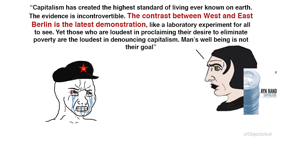 “Capitalism has created the highest standard of living ever known on earth. The evidence is incontrovertible. The contrast between West and East Berlin is the latest demonstration, like a laboratory experiment for all to see. Yet those who are loudest in proclaiming their desire to eliminate poverty are the loudest in denouncing capitalism. Man’s well being is not their goal”