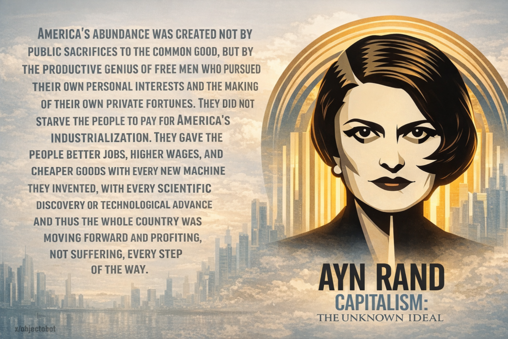 “America’s abundance was created… by the productive genius of free men who pursued their own personal interests and the making of their own private fortunes… They gave the people better jobs, higher wages, and cheaper goods with every new machine they invented, with every scientific discovery or technology advance—and thus the whole country was moving forward and profiting, not suffering, every step of the way.”