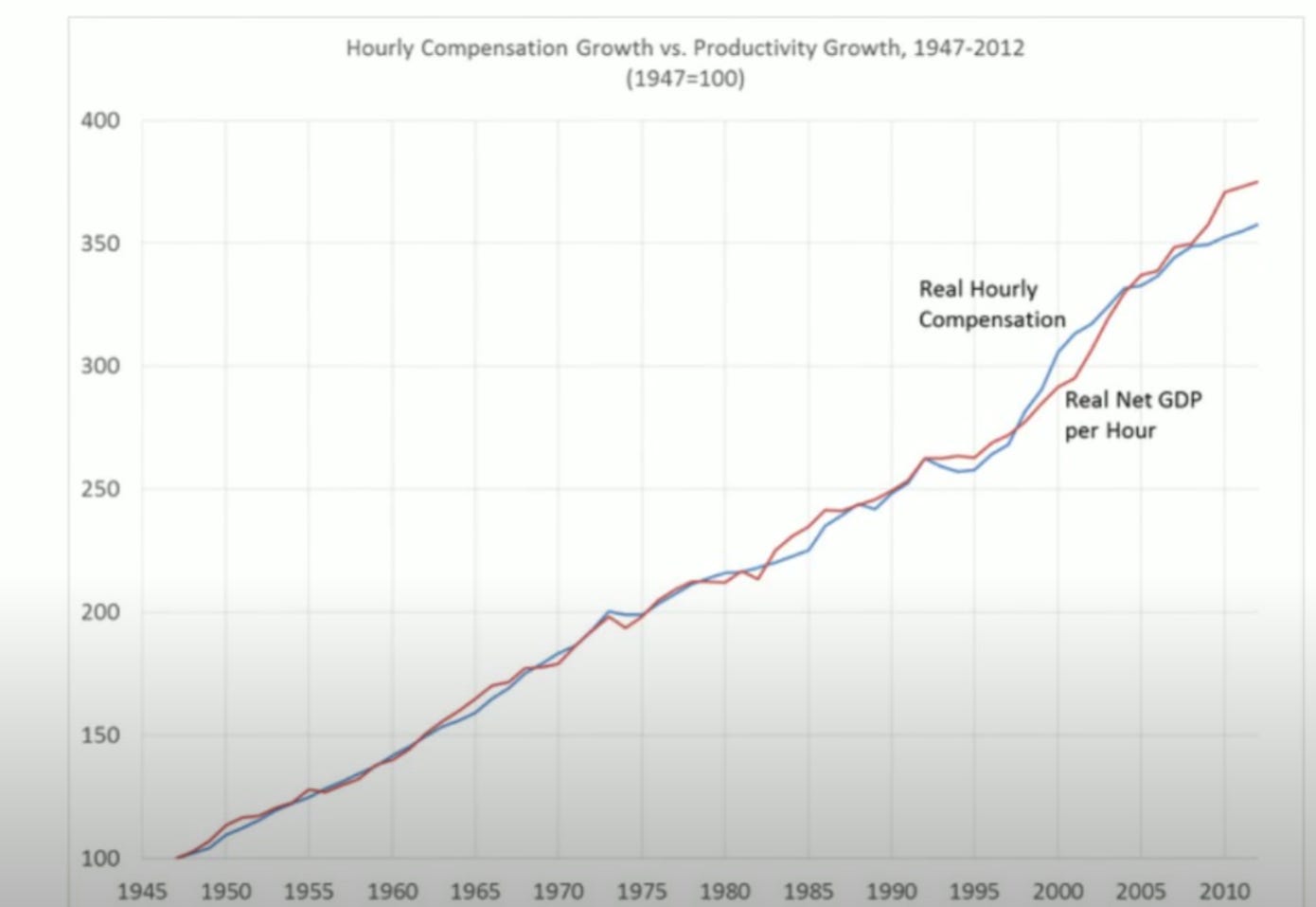Firstly productivity can be significantly impacted by foreign imports becoming cheaper. This appears as a worker productivity increase, but it is really due to trade. And secondly, the modern heavy reliance on computers, which quickly become obsolete has increased the capital depreciation rates as compared to 1970s when firms would invest in capital like buildings and machinery. We can easily adjust for both and when we do, compensation and productivity track almost perfectly.