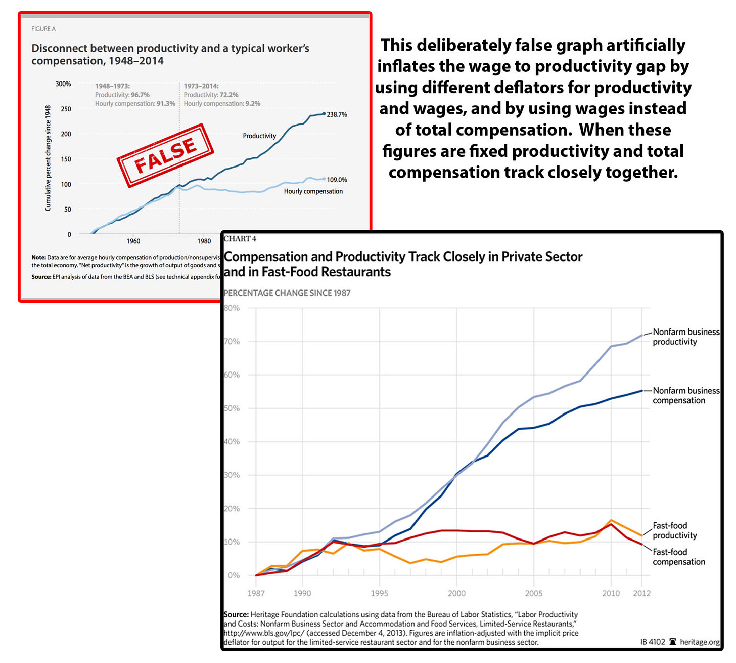 The truth is that the above graph is fake. Made in 2012 by a leftist think tank, the Economic Policy Institute, popularized and shared by Senator Elizabeth Warren, and was almost immediately debunked. But that hasn’t stopped EPI( Economic Policy Institute) or anyone from continuing to share to this day.