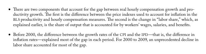 The first reason is the same as hours, the difference in how compensation and productivity is adjusted for inflation. Their reason for why there is a growing gap in the different inflation adjustment is also computers.