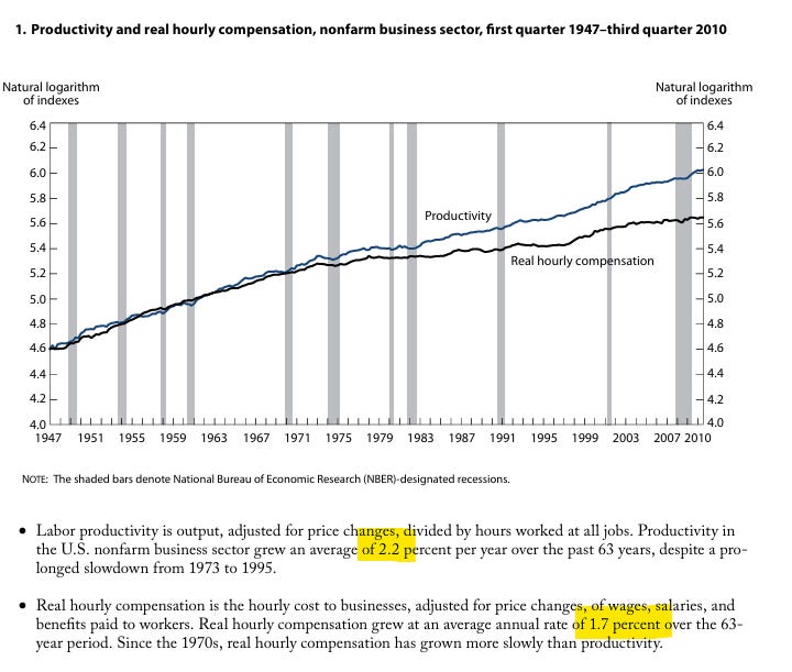 BLS finds a small gap developing between productivity and compensation. They find that on average producivity has grow 2.2% per year while compensation only 1.7%.