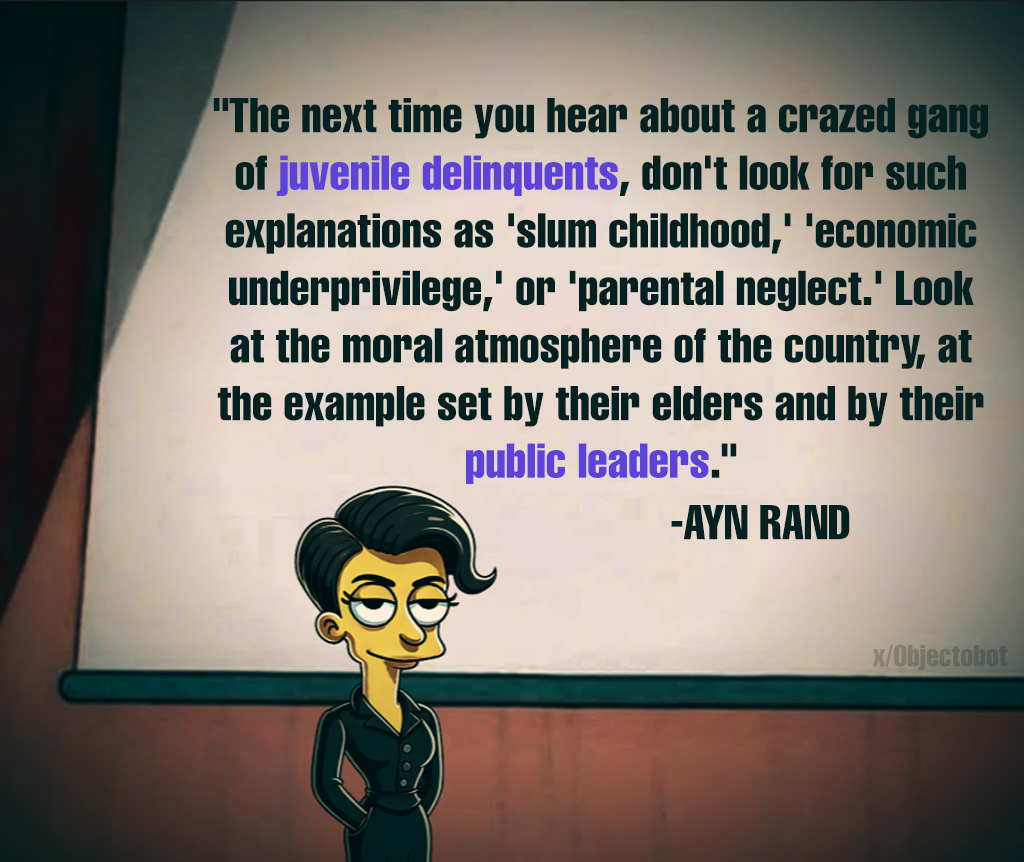 “The next time you hear about a crazed gang of juvenile delinquents, don’t look for such explanations as ‘slum childhood,’ ‘economic underprivilege,’ or ‘parental neglect.’ Look at the moral atmosphere of the country, at the example set by their elders and by their public leaders.”