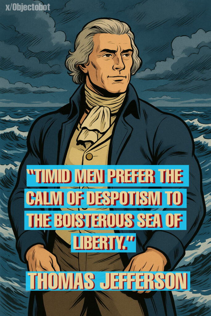 Thomas Jefferson Timid Men admin October 6, 2025 “TIMID MEN PREFER THE CALM OF DESPOTISM TO THE BOISTEROUS SEA OF LIBERTY.” THOMAS JEFFERSON admin