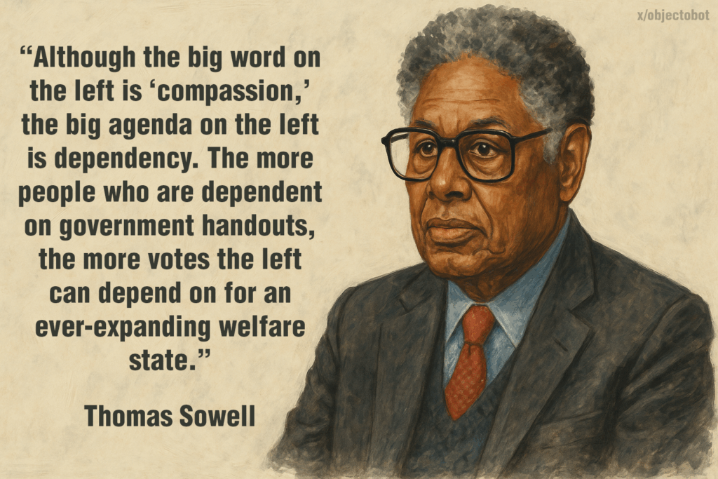 “Although the big word on the left is ‘compassion,’ the big agenda on the left is dependency. The more people who are dependent on government handouts, the more votes the left can depend on for an ever-expanding welfare state.”