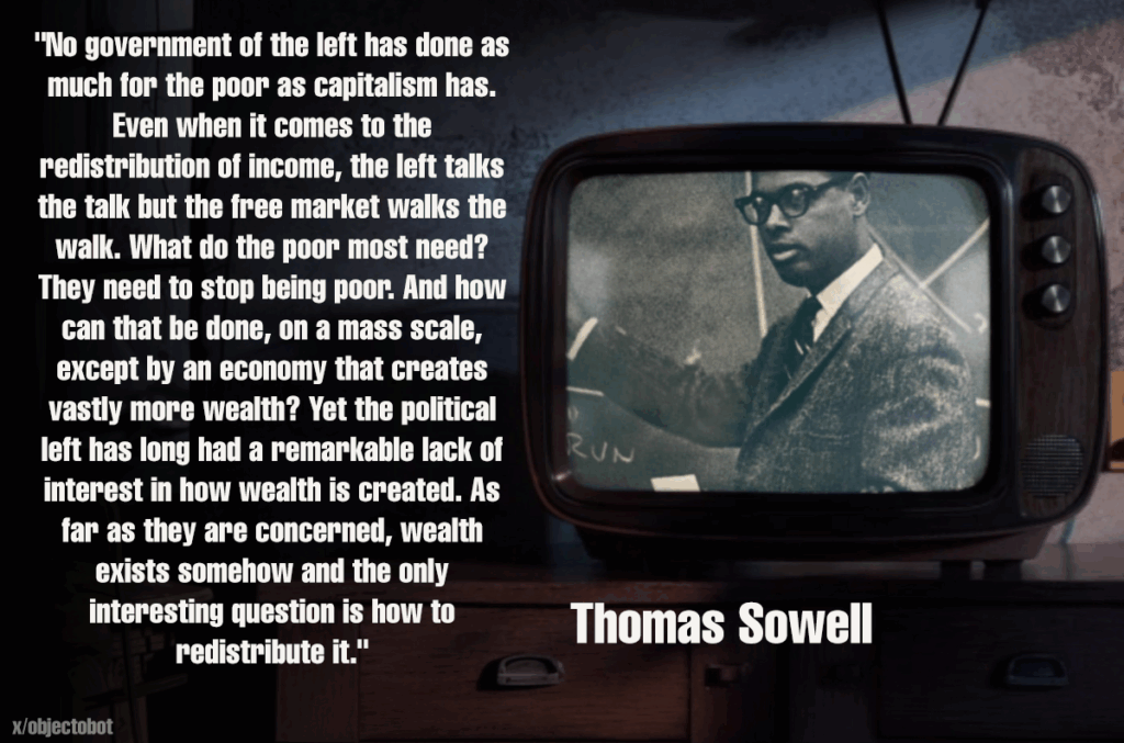 “No government of the left has done as much for the poor as capitalism has.Even when it comes to the redistribution of income, the left talks the talk but the free market walks the walk. What do the poor most need? They need to stop being poor. And how can that be done, on a mass scale, except by an economy that creates vastly more wealth? Yet the political left has long had a remarkable lack of interest in how wealth is created. As far as they are concerned, wealth exists somehow and the only interesting question is how to redistribute it.”Thomas Sowell