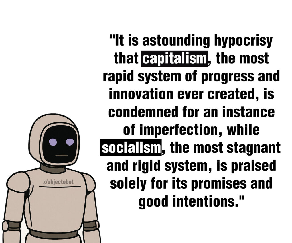 “It is astounding hypocrisy that capitalism, the most rapid system of progress and innovation ever created, is condemned for an instance of imperfection, while socialism, the most stagnant and rigid system, is praised solely for its promises and good intentions.”